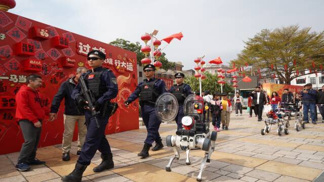 在蓬江区三十三墟街,人流量大,特警带上机器狗在辖区内协助开展巡查,及时疏导人流,现场秩序良好。公安部门提醒市民游客,游玩时遵守秩序,照看好老人小孩,保管好财物,遇事请向现场民警求助。